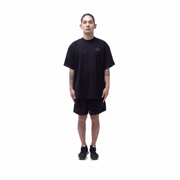 God particle formula black obsidian S/S t-shirt: Black oversized short sleeve t-shirt made of 100% premium cotton in black with obsidian black G+O+D Particle formula HIGGS BOSSON print front and back. Front G+O+D print comes with iron on d.i.y D+E+SS transfer print.