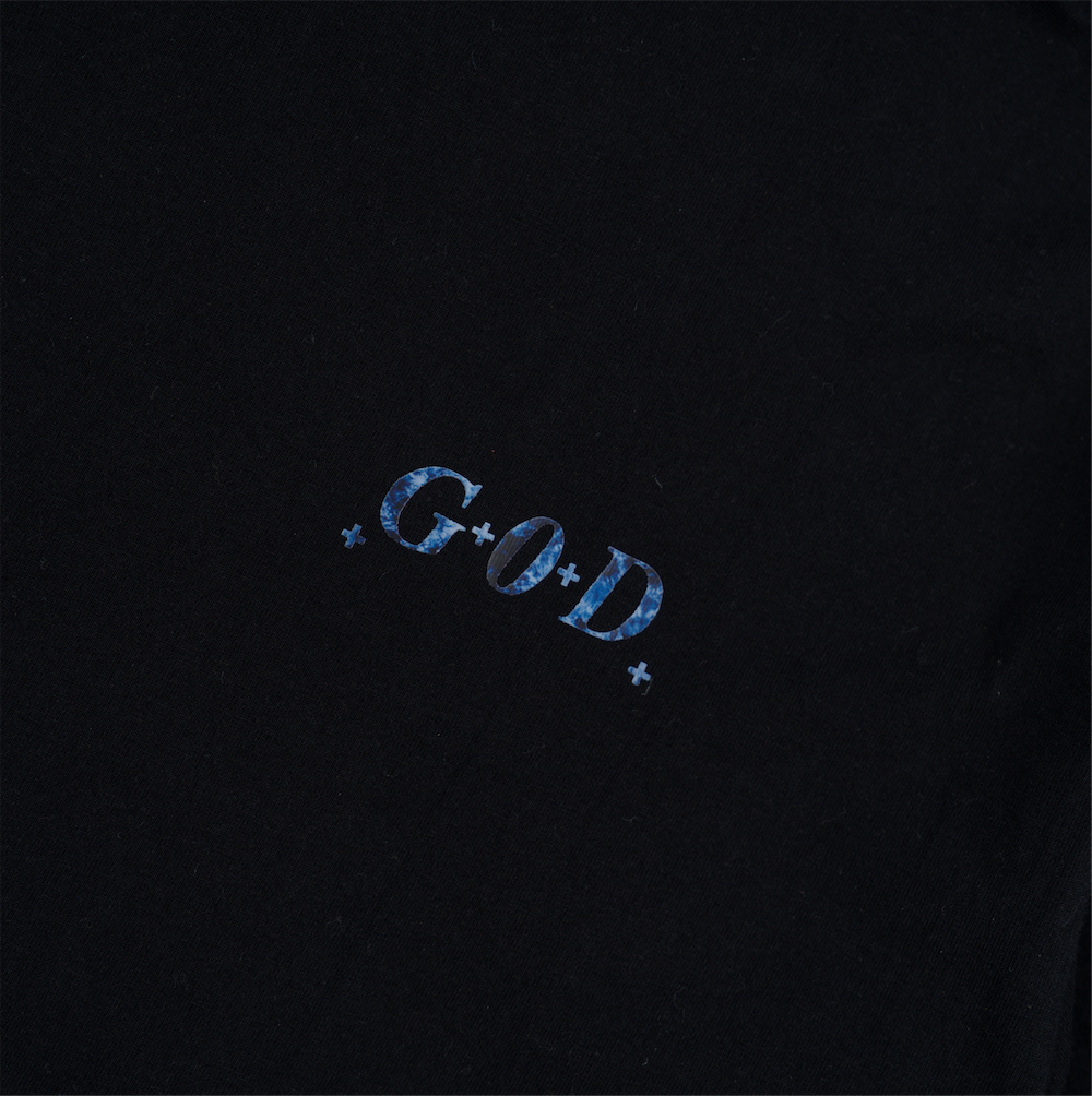 GOD Particle formula black tie dye S/S T-Shirt: Black oversized short sleeve t-shirt made of 100% premium cotton in black with obsidian black G+O+D Particle formula HIGGS BOSSON print front and back. Front G+O+D print comes with iron and d.i.y D+E+SS transfer print.