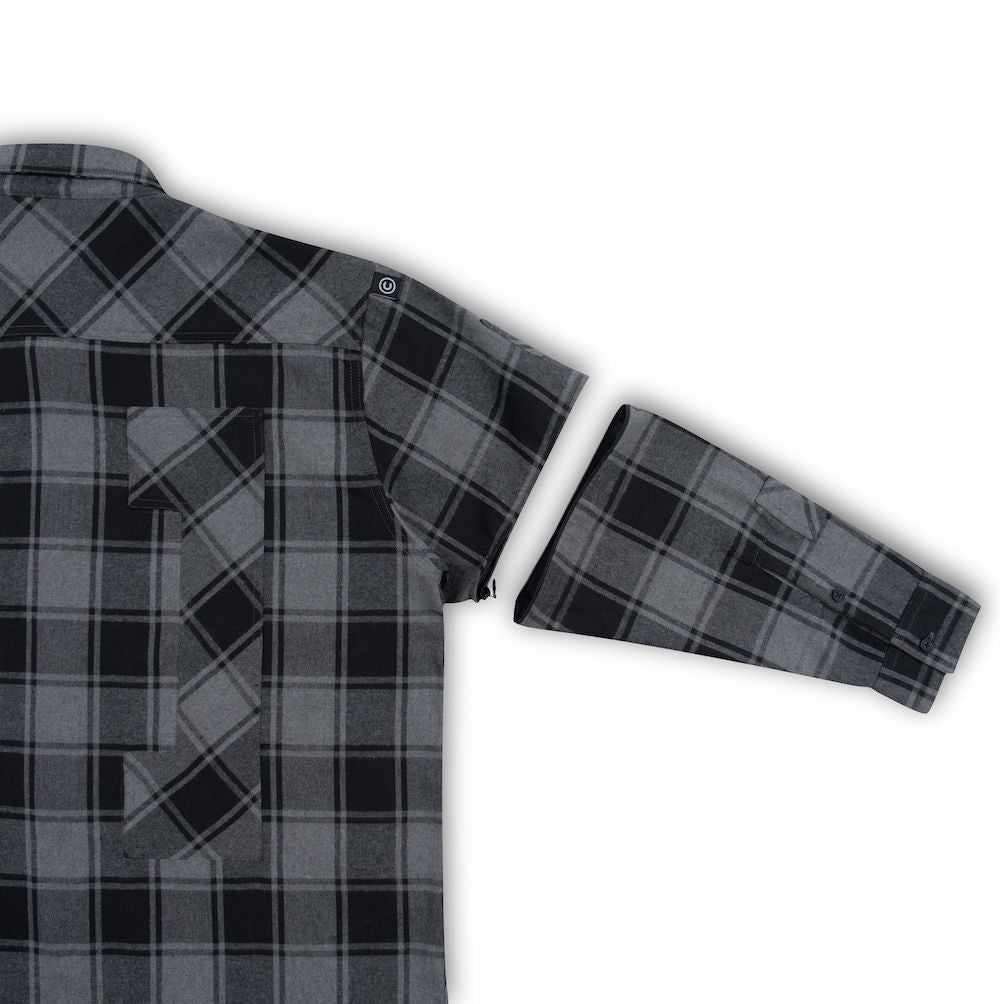 Grey Zip Off Sleeve Flannelette Shirt - Loose fit w/ zip off arm sleeves. Large pocket and [CPSL] rubber patch embelishment. Bracket panel patches on back and sleeves. Soft brush hand feel 100% flannel cotton fabric