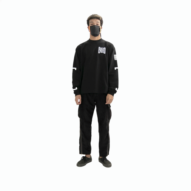 Visionary black long sleeve t-shirt. Made from 100% premium cotton, rib knit crewneck trim, reinforced sleeves and hem seams. With sublimated scannable Q.R print on front that links to capsulclothing.com. [CAPSUL]©️ VISIONARY print on back and [bracket] print on both sleeves. Limited collection patch numbered from 001 - 111 / 111 making every piece exclusive.