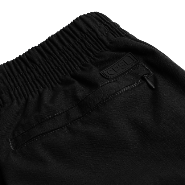 Black U.A.P tech shorts- W/ large cargo pocket and smaller secure fit mobile phone pocket. W/ [CAPSUL] and U.A.P patches and reinforced double hem stitching. U.A.P is [CAPSUL]'s technical design division.